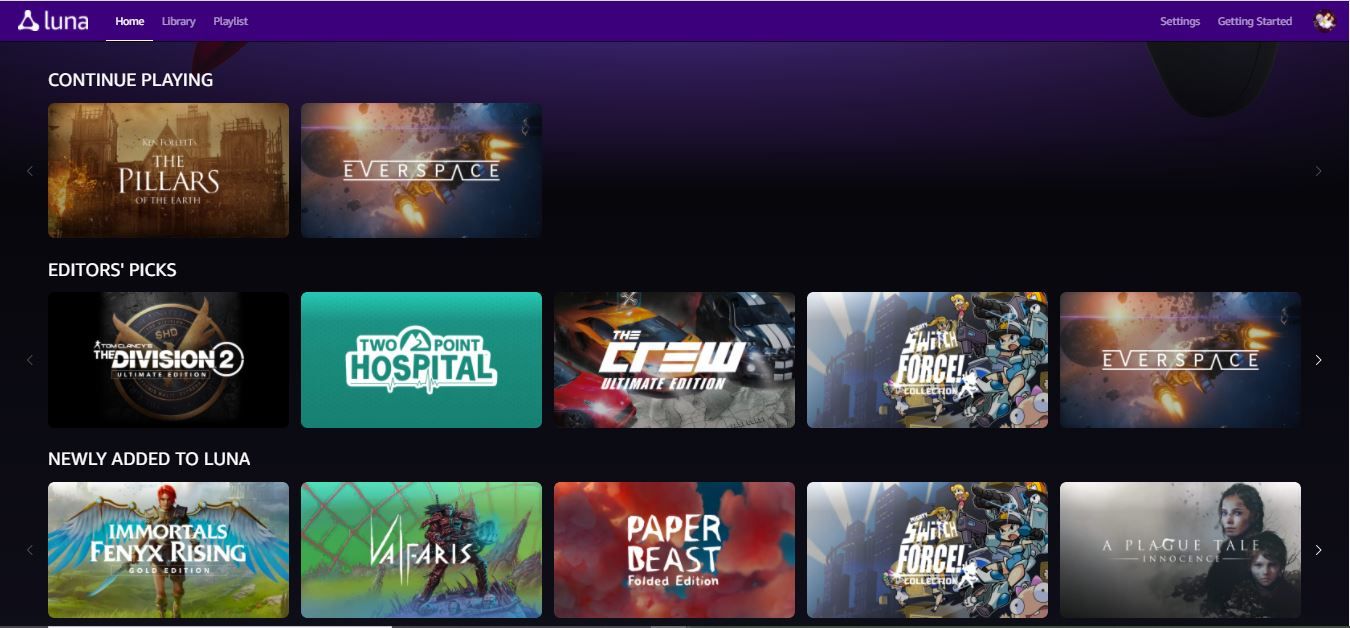 Amazon Luna’s homepage looks rather like the homepage for streaming services like Hulu. A Continue Playing category tops the page, followed by Editors Picks, Newly Added to Luna, games available on other channels, and so on.