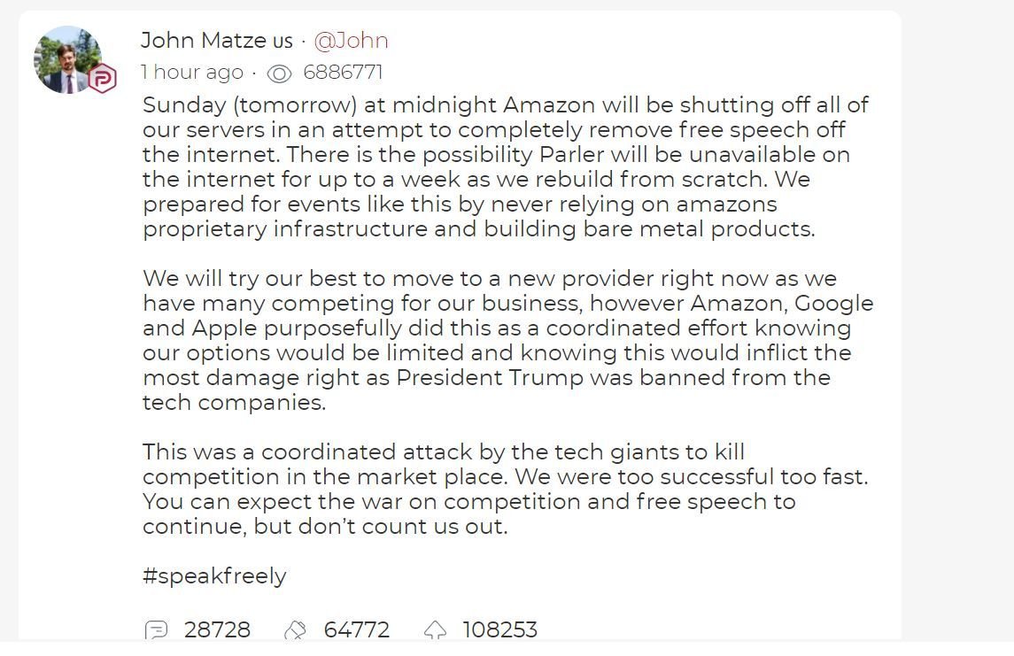 John Matze, CEO of Parler, responded to Amazon’s ban in a post on Parler.