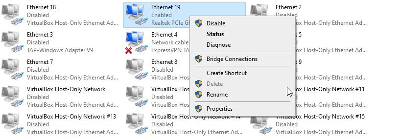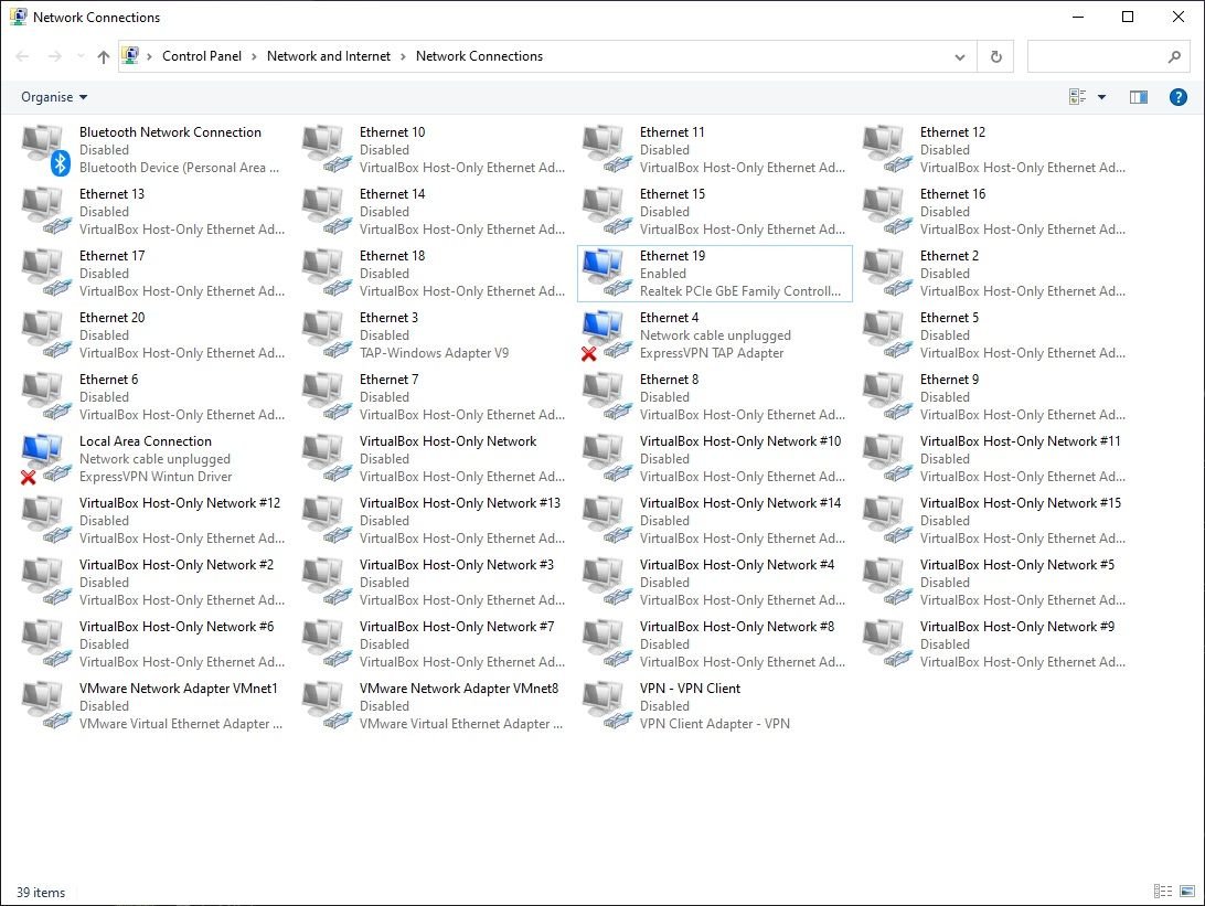 Furthermore, you might want to remove virtual network adapters for old virtual machines you no longer use if the host software hasn't automatically cleaned up. In my case, virtual machine software created over 20 different virtual network adapters, filling the entire window with different options.