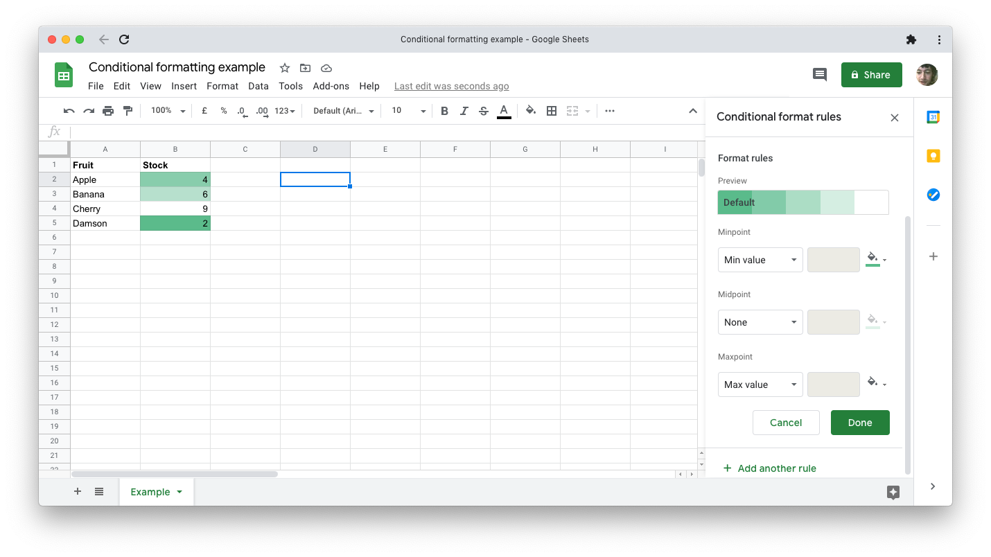 Google Sheets’ implementation is limited, but very easy to use. Select a range of numbers, as before, but this time, change the tab near the top of the Conditional format rules window from Single color to Color scale.