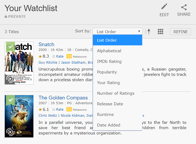 You can order your shows by rating, runtime, number of user ratings, your own ratings, popularity, and IMDb ratings. You can also easily filter by either movies or TV series, rather than having everything in a single list.