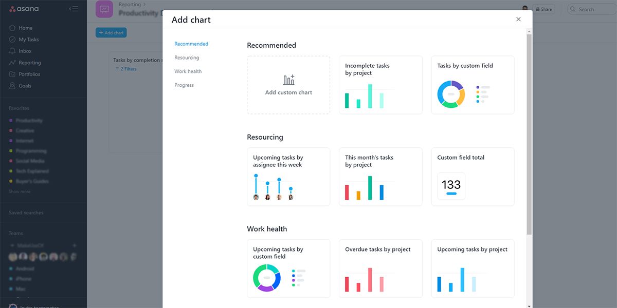 After you create a dashboard in the Asana Reporting section, you can add charts. When you click on Add chart, you’ll see 10 types of chart templates segregated within four sections. The followings chart types are the most popular ones in Asana reporting: